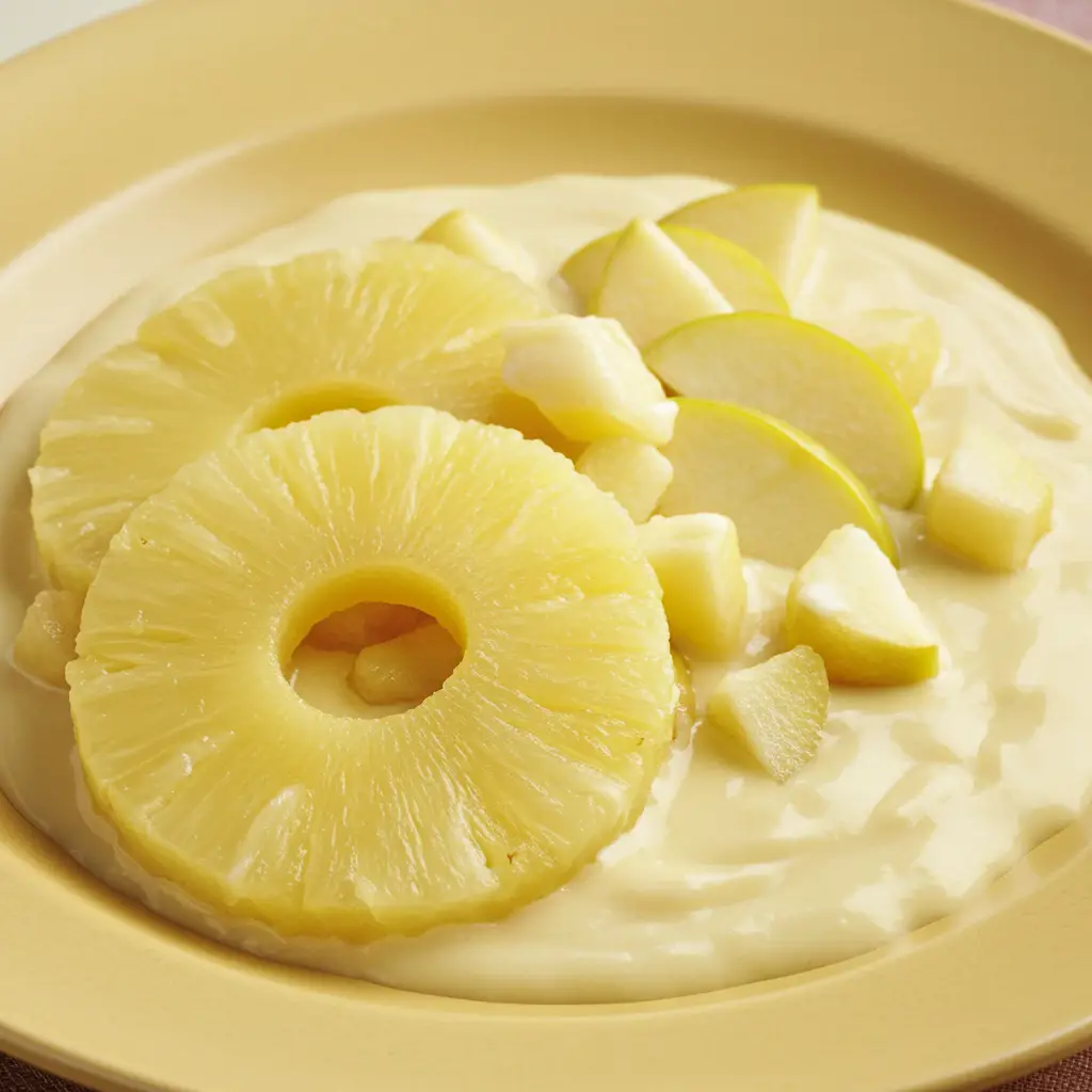 Uma sobremesa leve e refrescante, perfeita para um dia quente. Rodelas de abacaxi e maçã macias, mergulhadas em uma calda cremosa e doce. Uma explosão de sabores tropicais!