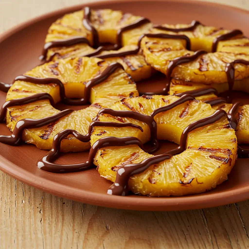 Rodelas de abacaxi grelhadas, macias e levemente caramelizadas, cobertas por uma irresistível calda de chocolate meio amargo. Uma sobremesa simples e sofisticada, perfeita para encantar seus convidados.