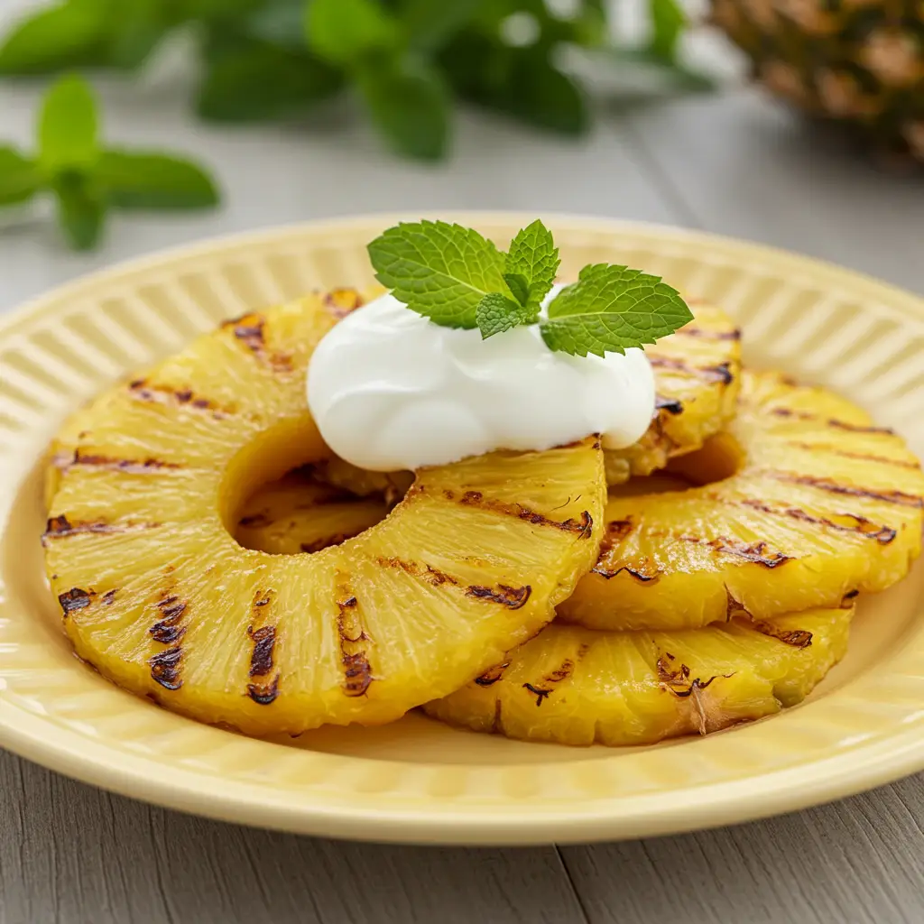 Um doce tropical refrescante e fácil de preparar! Fatias de abacaxi grelhadas ao açúcar, finalizadas com sorvete de coco cremoso e raspas de limão siciliano. Perfeito para um final de tarde.