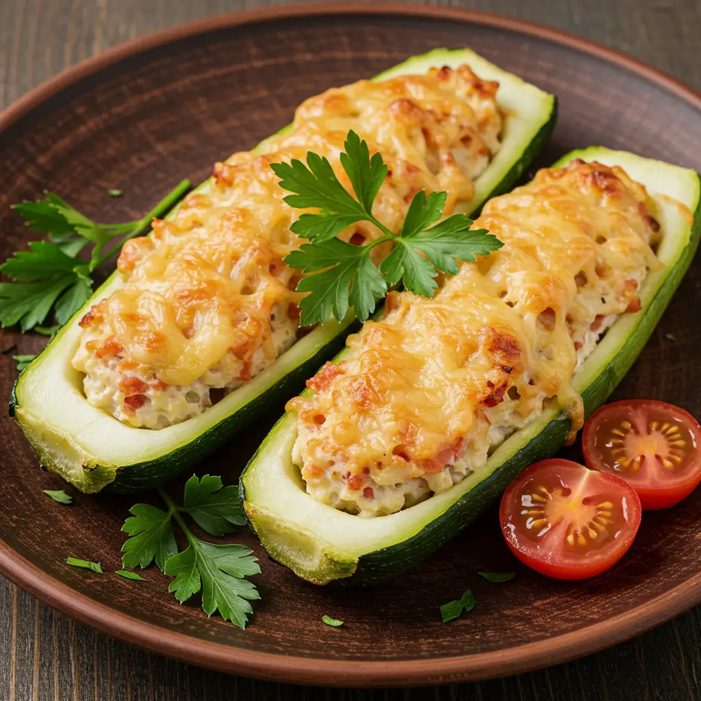 Deliciosas abobrinhas recheadas com um saboroso frango, gratinadas com mussarela e finalizadas com um toque de creme de leite. Uma opção leve e saborosa para um jantar especial!
