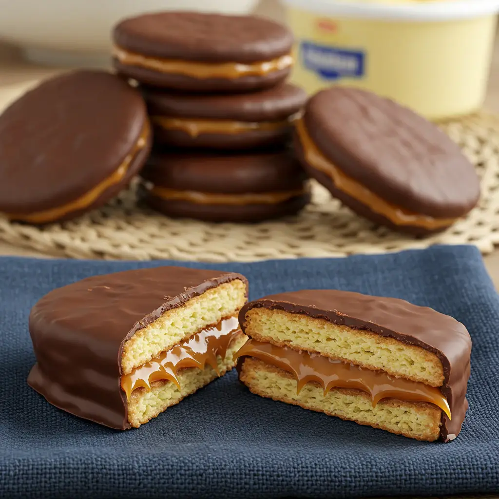 Deliciosos alfajores caseiros, com biscoitos amanteigados, um recheio cremoso de doce de leite e cobertura de chocolate derretido. Uma combinação perfeita de texturas e sabores que vai te conquistar!