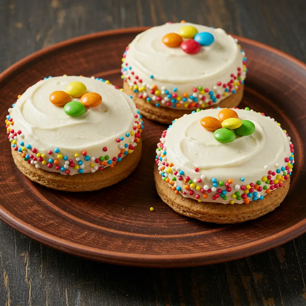 Deliciosos alfajores com um toque brasileiro, perfeitos para um chá da tarde especial. Recheio cremoso de doce de leite com canela e cobertura crocante de confeitos coloridos. Uma explosão de sabores e texturas!