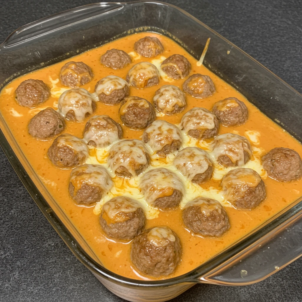 Em um refratário, arrume as almôndegas e despeje o molho cremoso por cima.