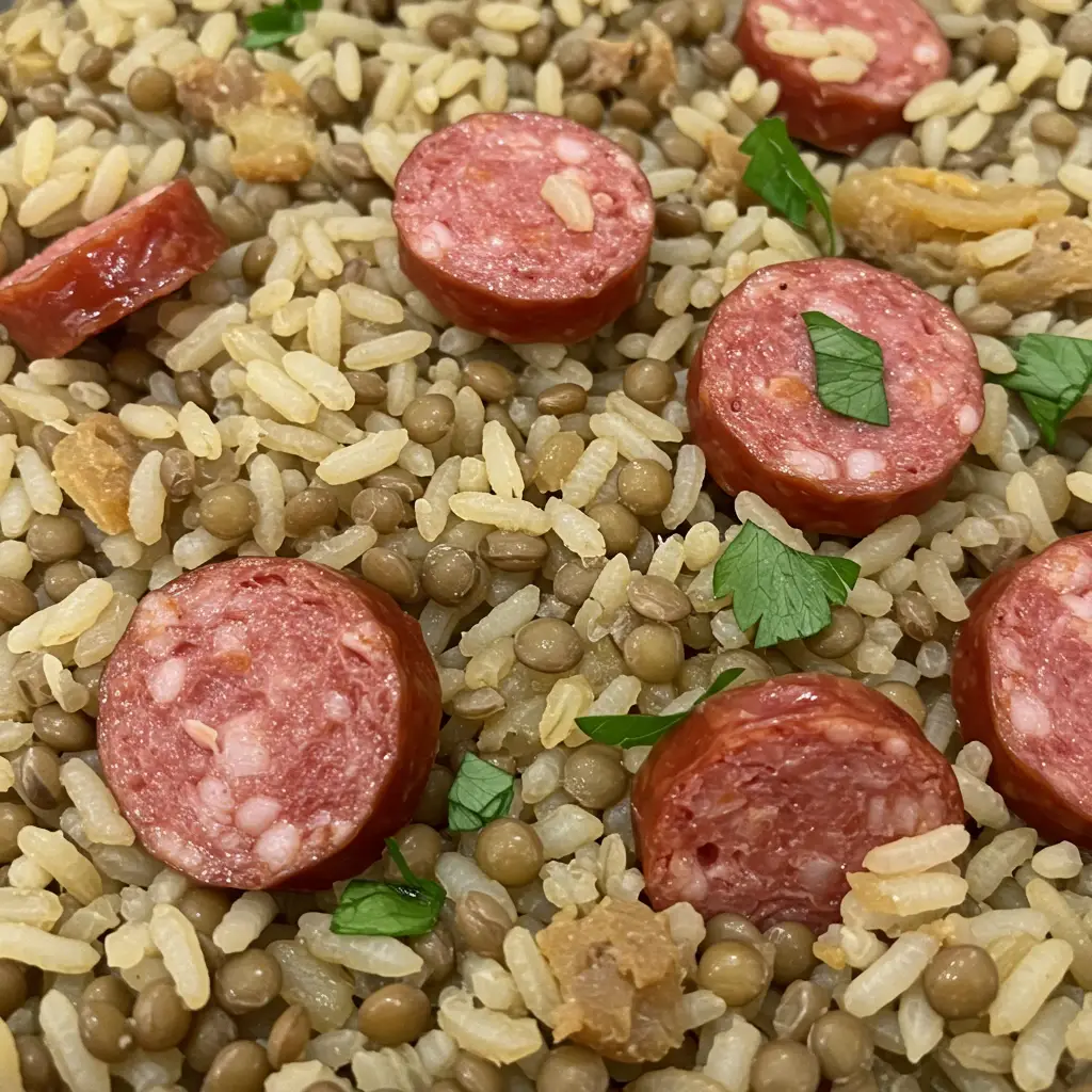 Um prato único saboroso e prático! Arroz cremoso, lentilha macia e calabresa bem douradinha, tudo cozido na panela de pressão para um jantar rápido e delicioso.