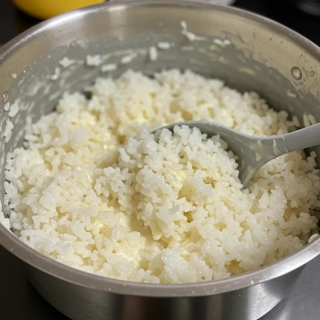 Após o arroz estar cozido, desligue o fogo e misture delicadamente o creme de leite até obter um arroz cremoso e homogêneo.