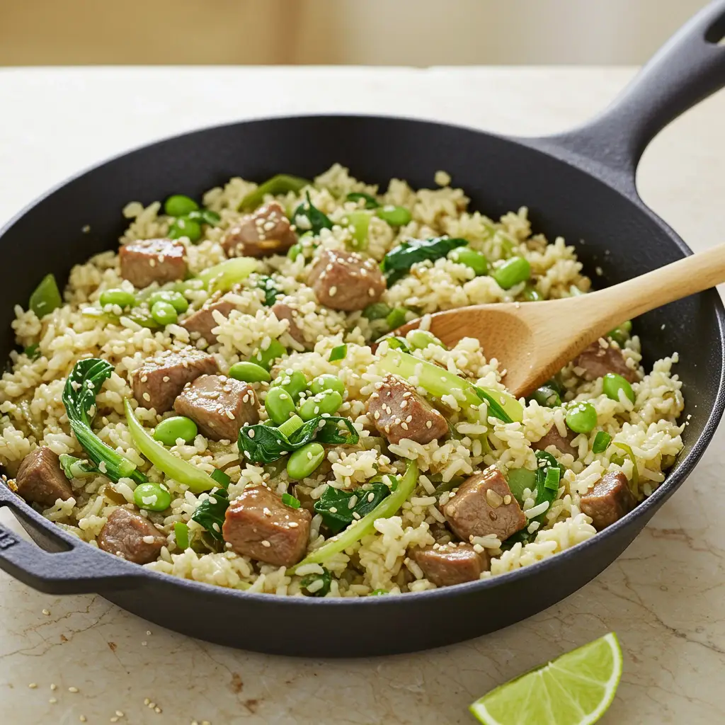 Adicione o tempero para arroz e misture bem. Junte os pinhões picados e a couve fatiada, refogando por mais 1 minuto.