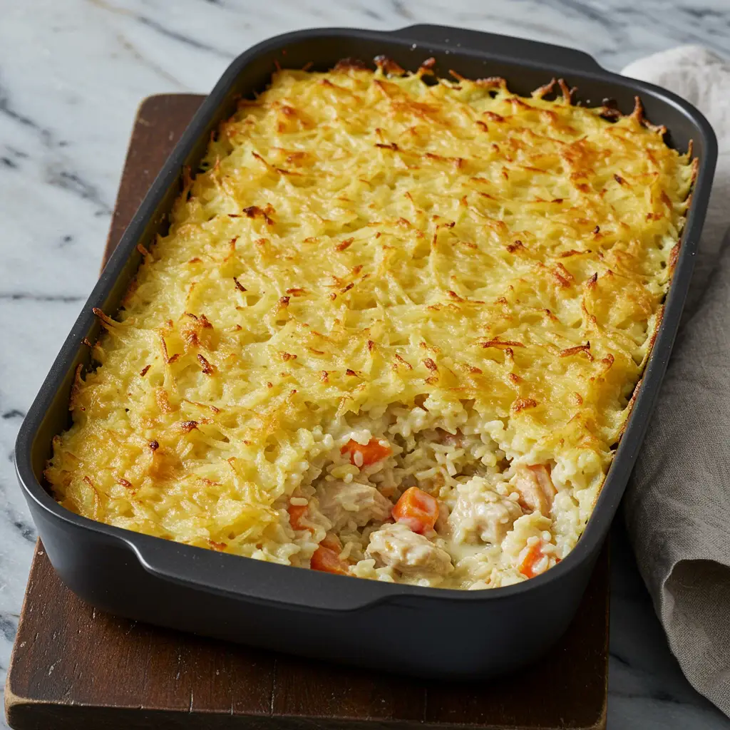 Um prato completo e saboroso, perfeito para um almoço em família! Arroz cremoso, frango desfiado e cenoura ralada, gratinado com batata palha crocante.