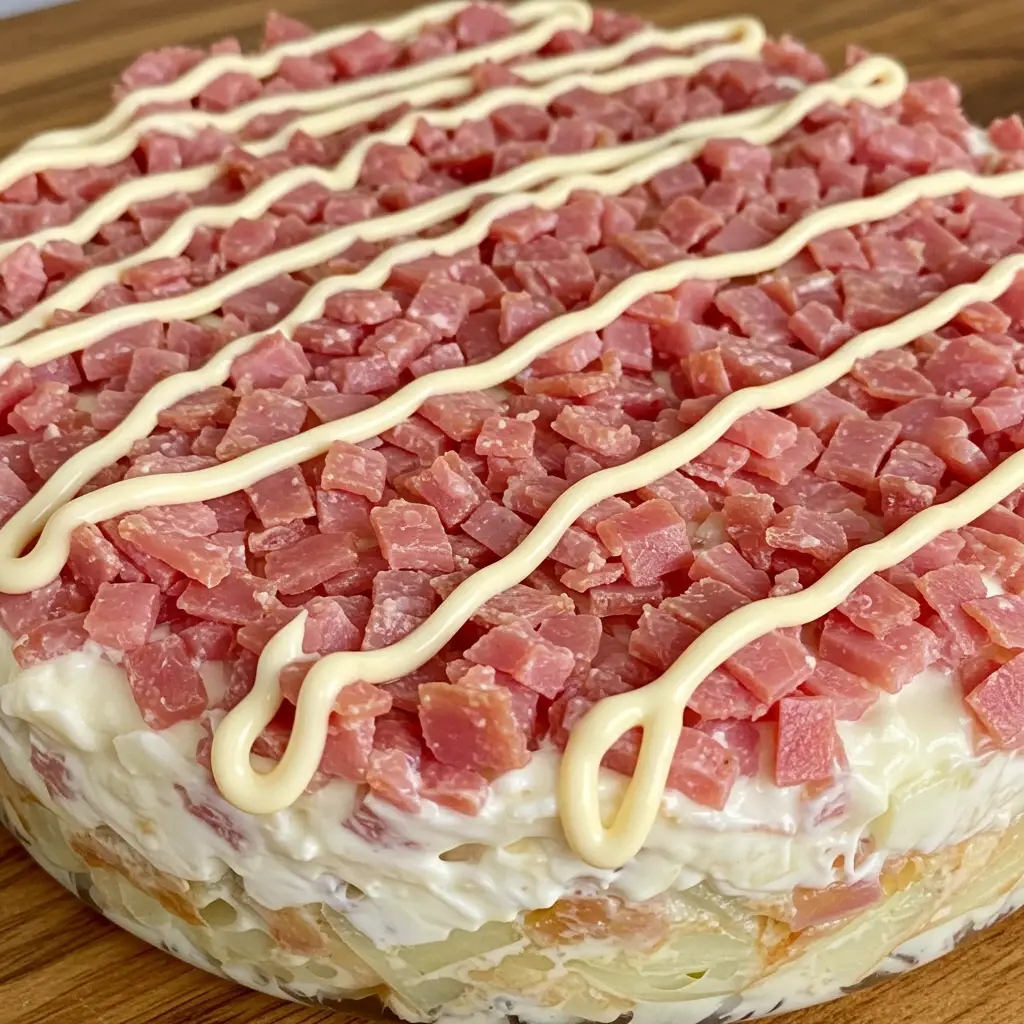 Distribua a mussarela e o presunto picados sobre o frango e finalize com o catupiry em pequenas porções por cima.