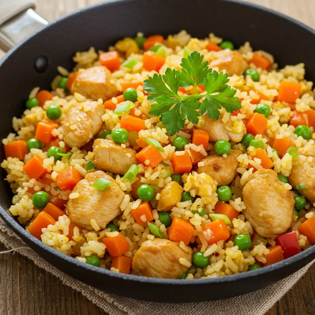 Uma deliciosa combinação de arroz frito com frango, legumes frescos e temperos que trazem um sabor especial a cada garfada. Ideal para uma refeição rápida e cheia de energia!