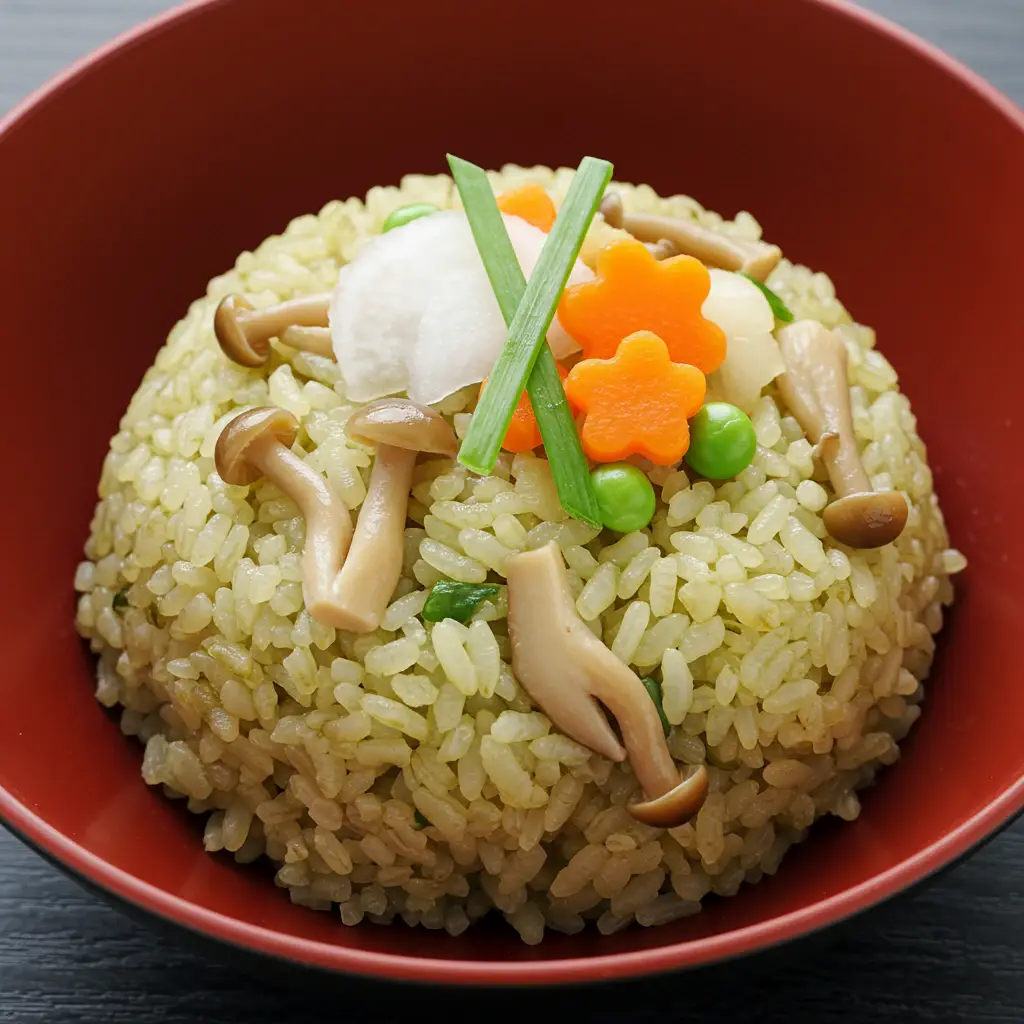 Um arroz japonês levemente verde, perfumado com ervas frescas e decorado com shiitake e cenoura. Uma opção saborosa e colorida para um almoço ou jantar especial.