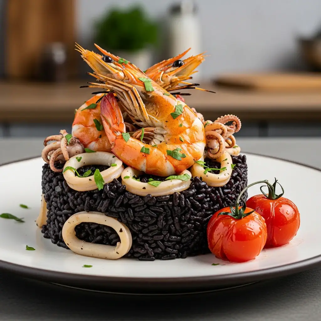 Um prato sofisticado e saboroso, que combina o arroz negro com o frescor do camarão e a textura da lula. Uma explosão de sabores do mar, perfeito para um jantar especial.