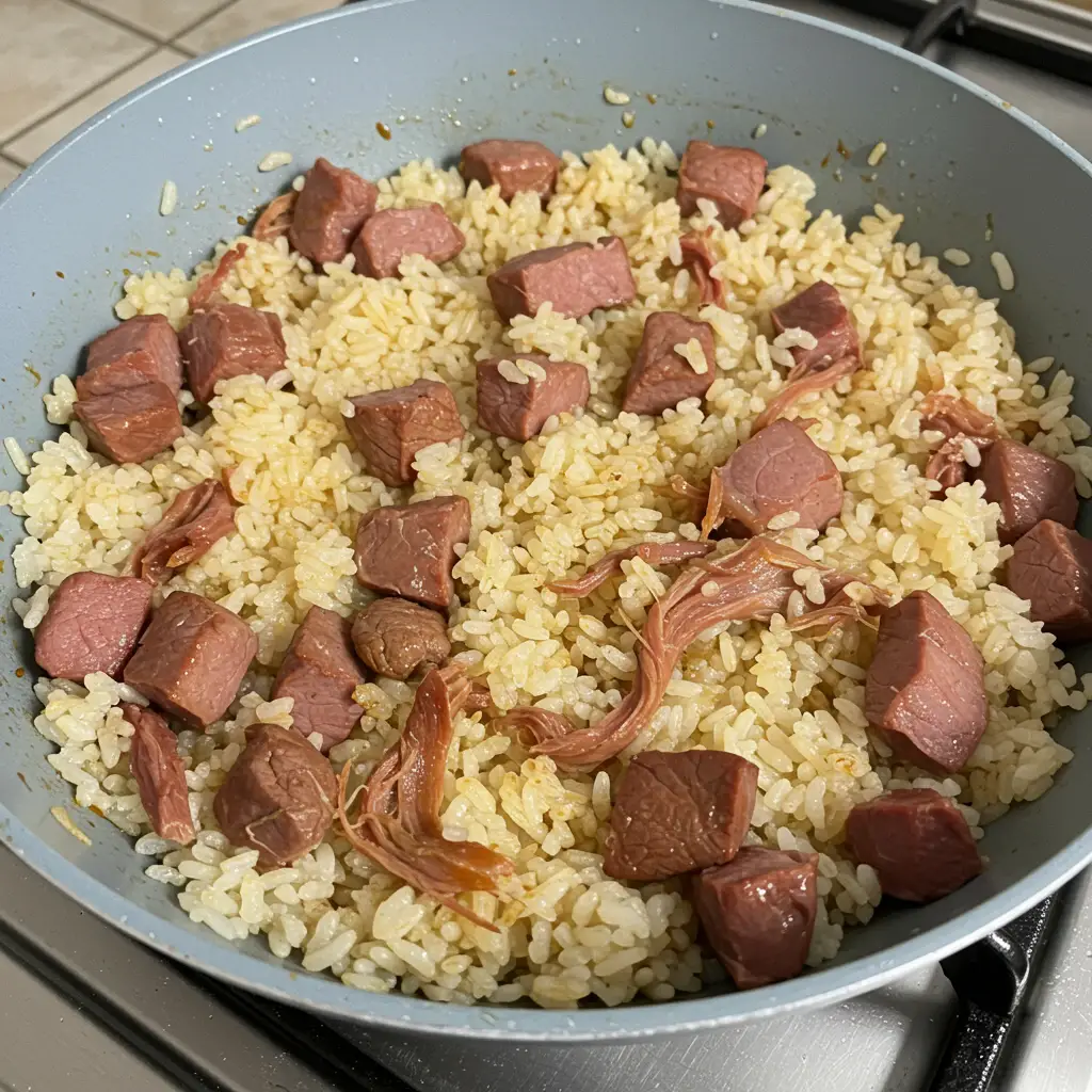 Acrescente o arroz parboilizado e misture bem para envolver todos os ingredientes.