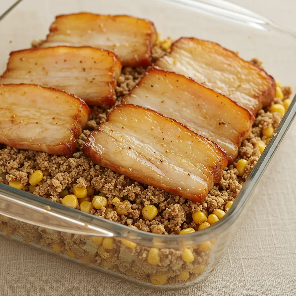 Leve a assadeira ao forno e asse por aproximadamente 45 minutos, ou até que o arroz esteja cozido e o bacon esteja dourado.