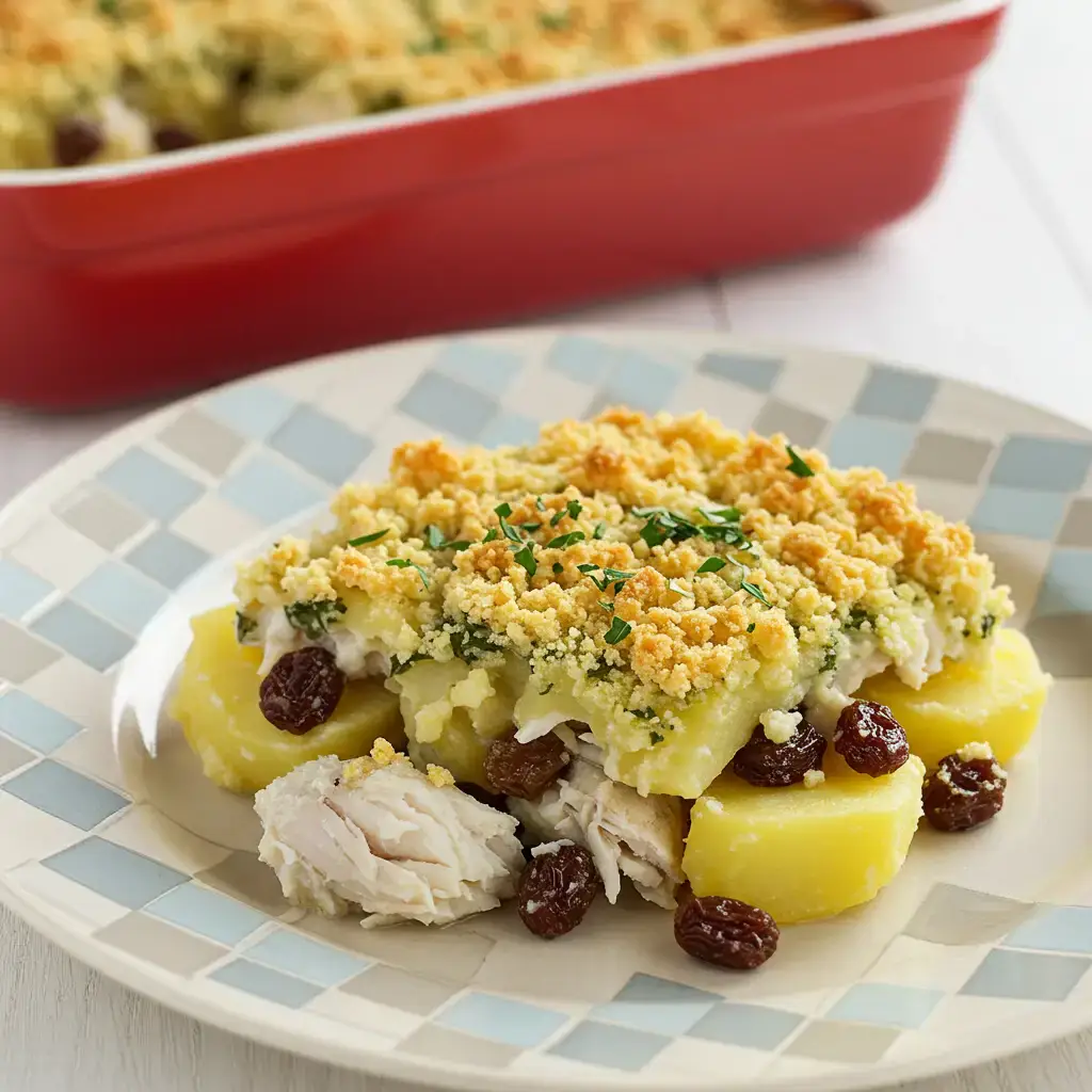 Repita as camadas com as batatas restantes, o restante do cheiro-verde e das passas.