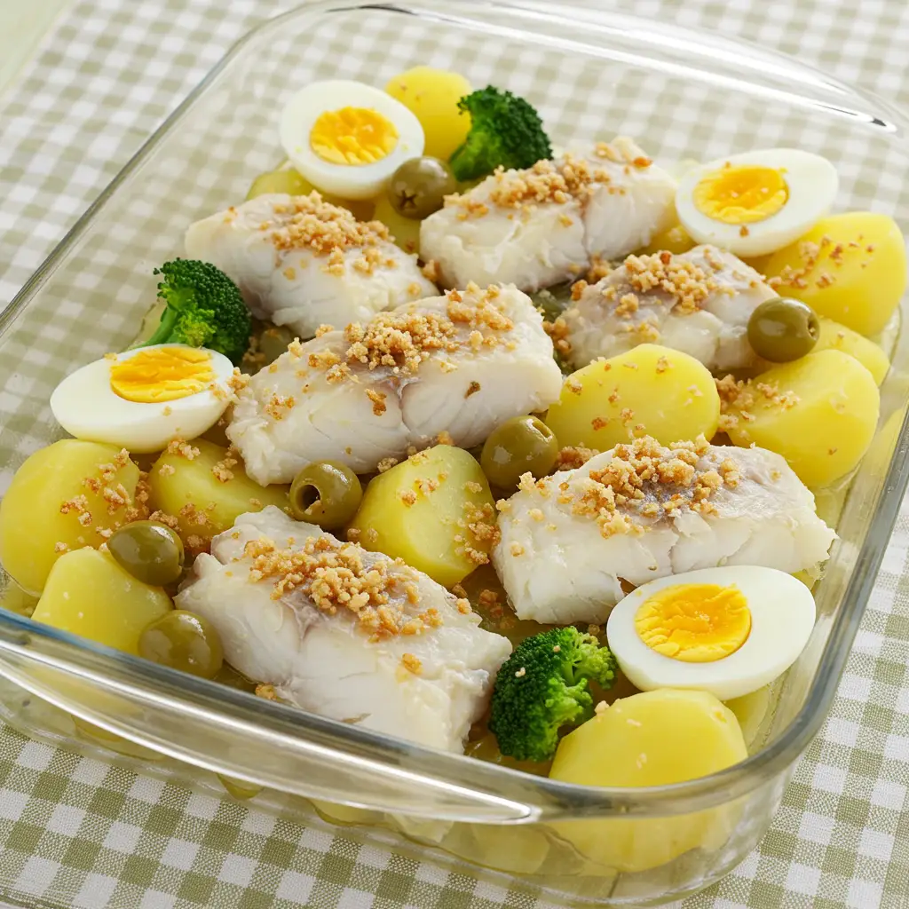 Em um refratário grande, misture as batatas, cebolas, brócolis, bacalhau, azeitonas e ovos cozidos.
