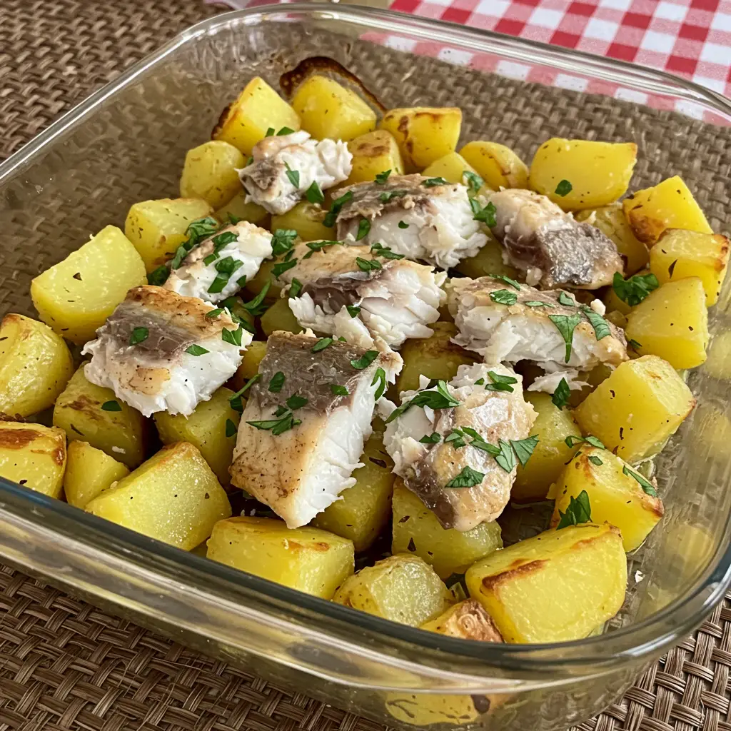 Em um refratário, arrume as batatas ao murro e disponha as lascas de bacalhau por cima.
