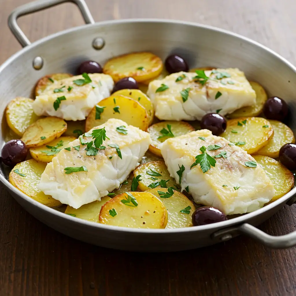 Transfira o bacalhau, as batatas e os legumes para uma travessa. Decore com as azeitonas antes de servir.
