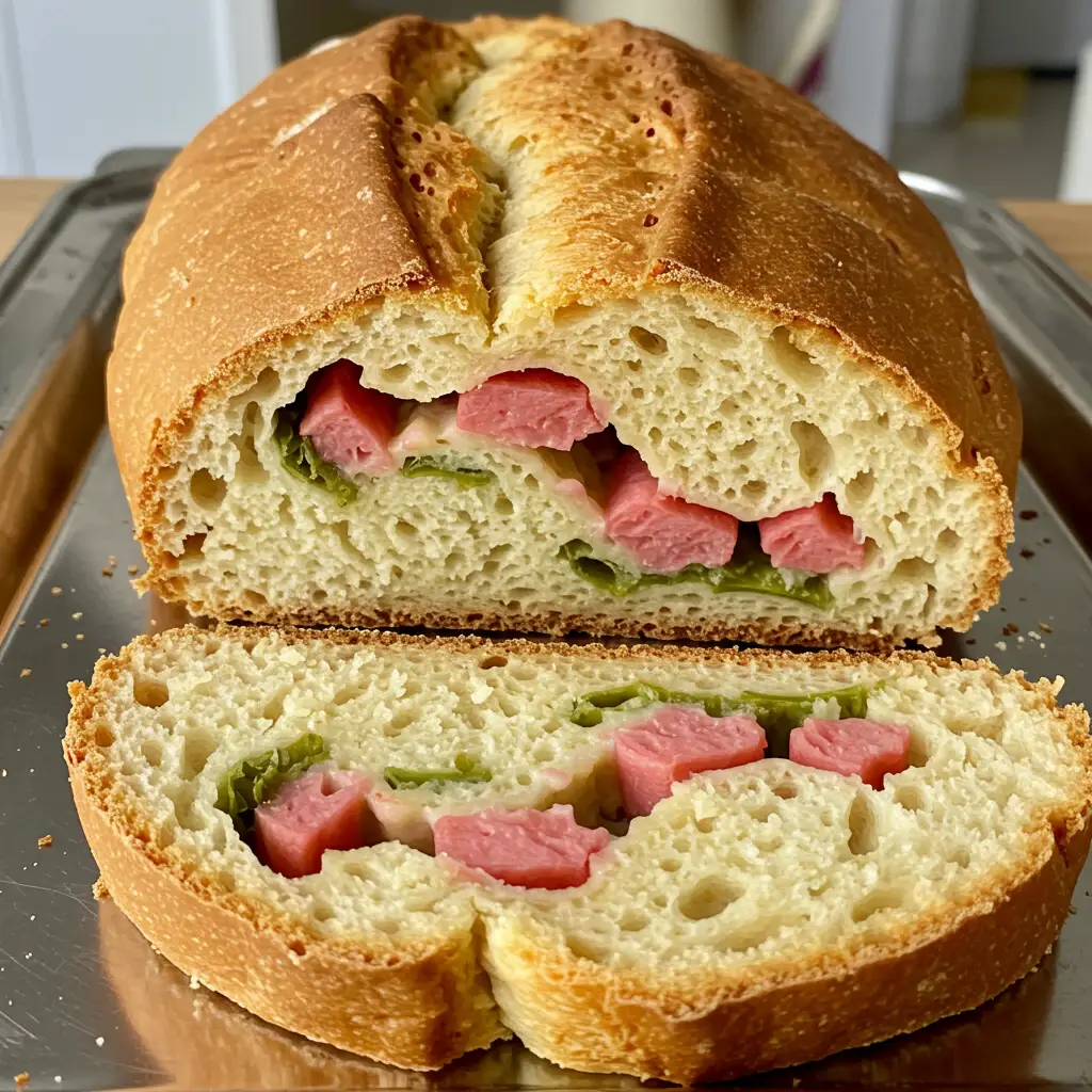 Uma deliciosa baguete caseira recheada com linguiça calabresa defumada, cebola e escarola. Perfeita para um lanche saboroso ou refeição leve. A massa macia e o recheio suculento irão te conquistar!