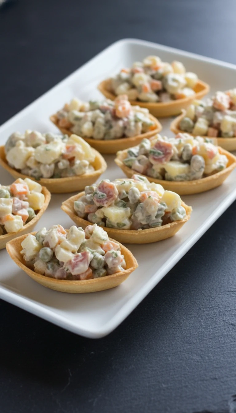 Deliciosas barquetes crocantes, recheadas com um saboroso mix de batata, seleta de legumes, azeitonas e salame. Uma entrada perfeita para festas e eventos!