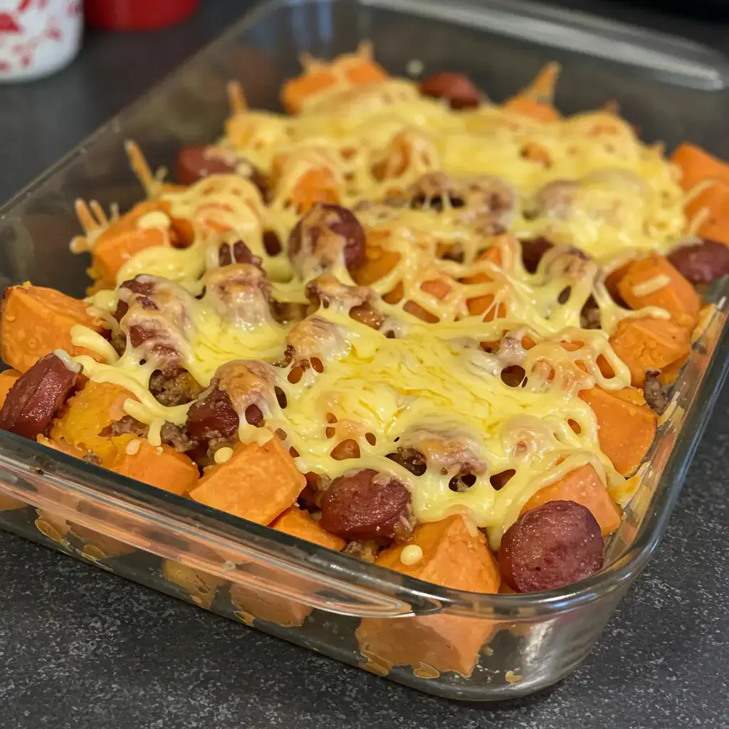 Uma combinação deliciosa e reconfortante! Batata doce cremosa, linguiça defumada saborosa e queijo derretido, uma explosão de sabores em cada garfada.