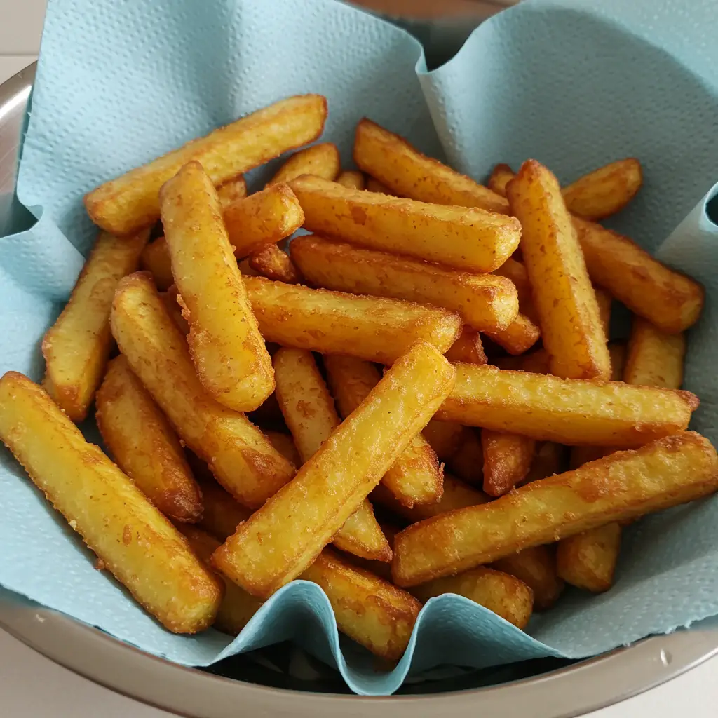 Frite as batatas em pequenas porções, tomando cuidado para não superlotar a panela, até ficarem douradas e crocantes.