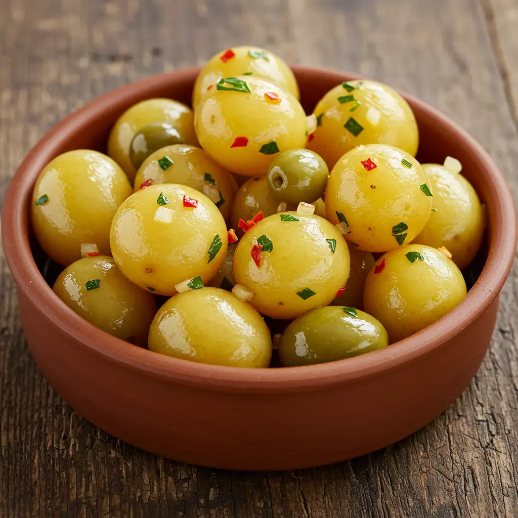 Deliciosas batatas bolinha em conserva, com um toque especial de chimichurri. Uma entrada perfeita para acompanhar carnes e queijos, ou um petisco saboroso para qualquer ocasião. Ideal para preparar com antecedência e surpreender seus convidados.