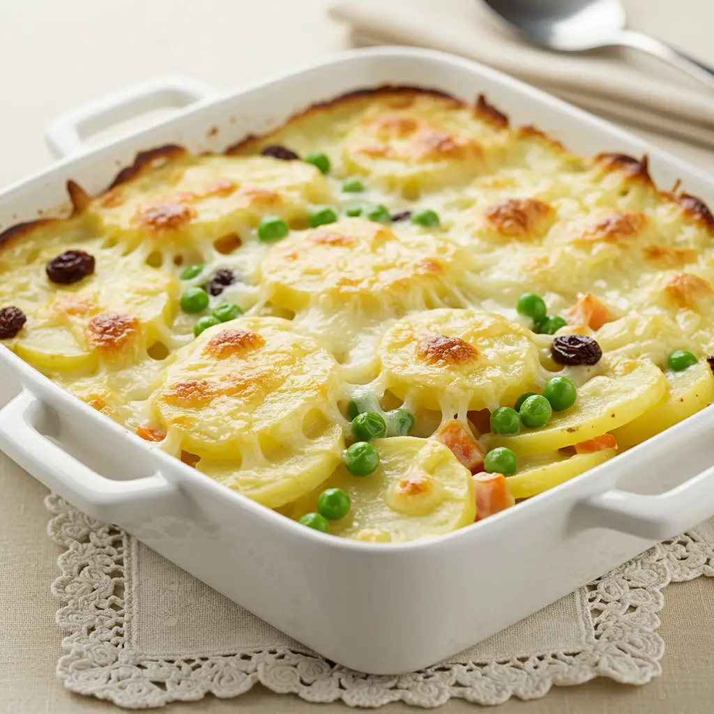 Um gratinado cremoso e saboroso, com batatas macias, ervilhas, cenoura, pimentão e um toque de uvas passas. O queijo prato e parmesão gratinados finalizam essa receita irresistível!