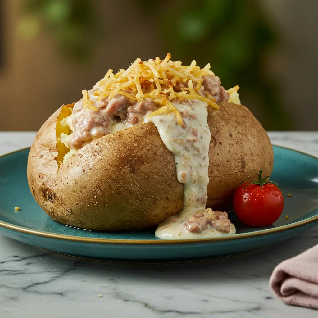 Deliciosas batatas assadas, macias por dentro e com um irresistível recheio de estrogonofe de filé mignon cremoso. Uma combinação perfeita de sabores que agrada a todos!