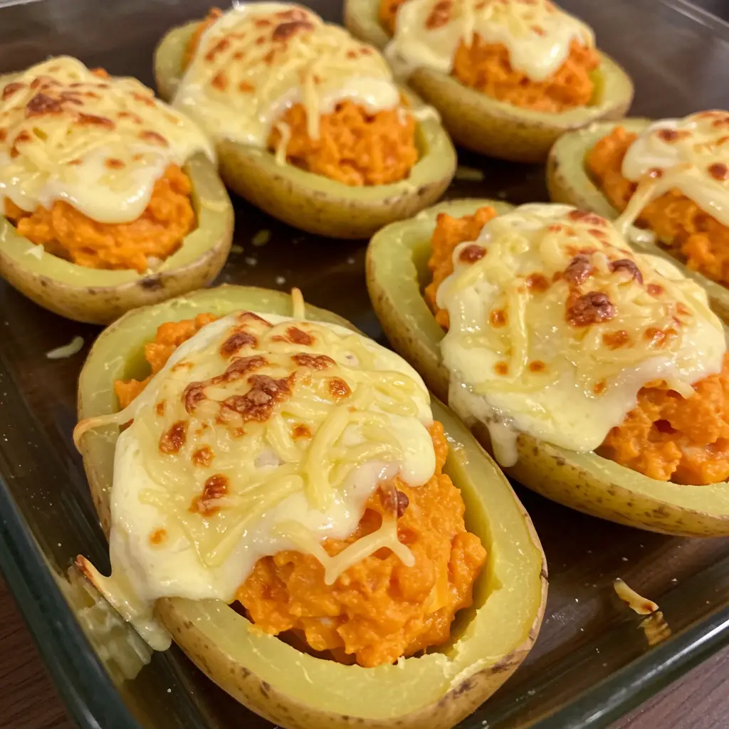 Deliciosas batatas assadas, recheadas com um cremoso misturado de bacon, cenoura e requeijão, cobertas por um irresistível molho branco e queijo gratinado. Uma combinação perfeita de sabores e texturas!