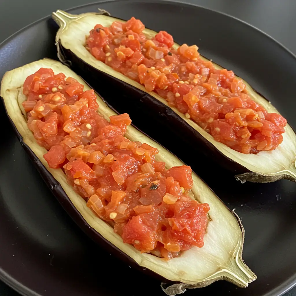 Uma berinjela suculenta recheada com um saboroso mix de tomate, cebola, alho e proteína de soja. Prato vegetariano simples e nutritivo, perfeito para um jantar leve e saboroso. Ideal para quem busca uma opção deliciosa e sem carne.