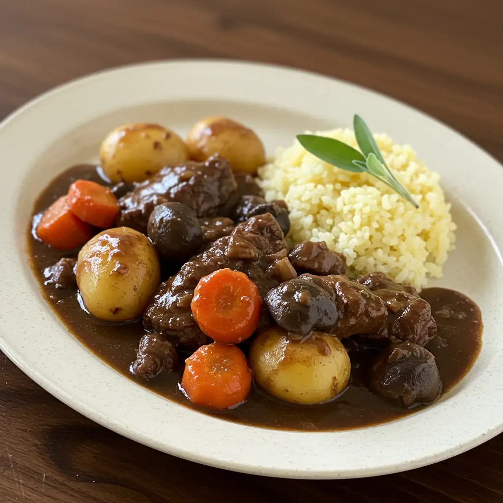 Um bife suculento, coberto por um molho saboroso de tomate e vinho, acompanhado de batatas e cenouras macias. Uma refeição completa e deliciosa!