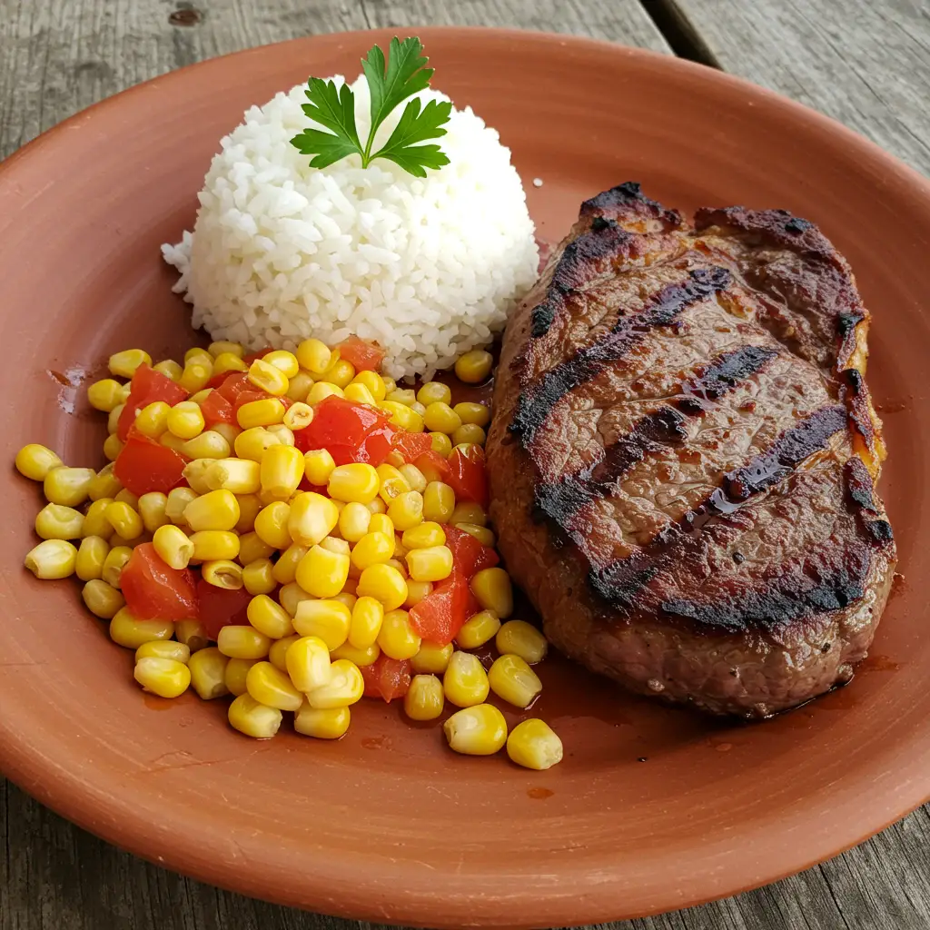 Um bife suculento grelhado, coberto por um delicioso refogado de tomate, pimentão e milho, finalizado com crocante batata palha. Uma refeição completa e saborosa!