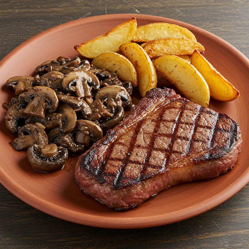 Um bife suculento grelhado, acompanhado de cogumelos salteados em manteiga e shoyu, e batatas crocantes temperadas com ervas. Uma combinação perfeita de sabores e texturas!