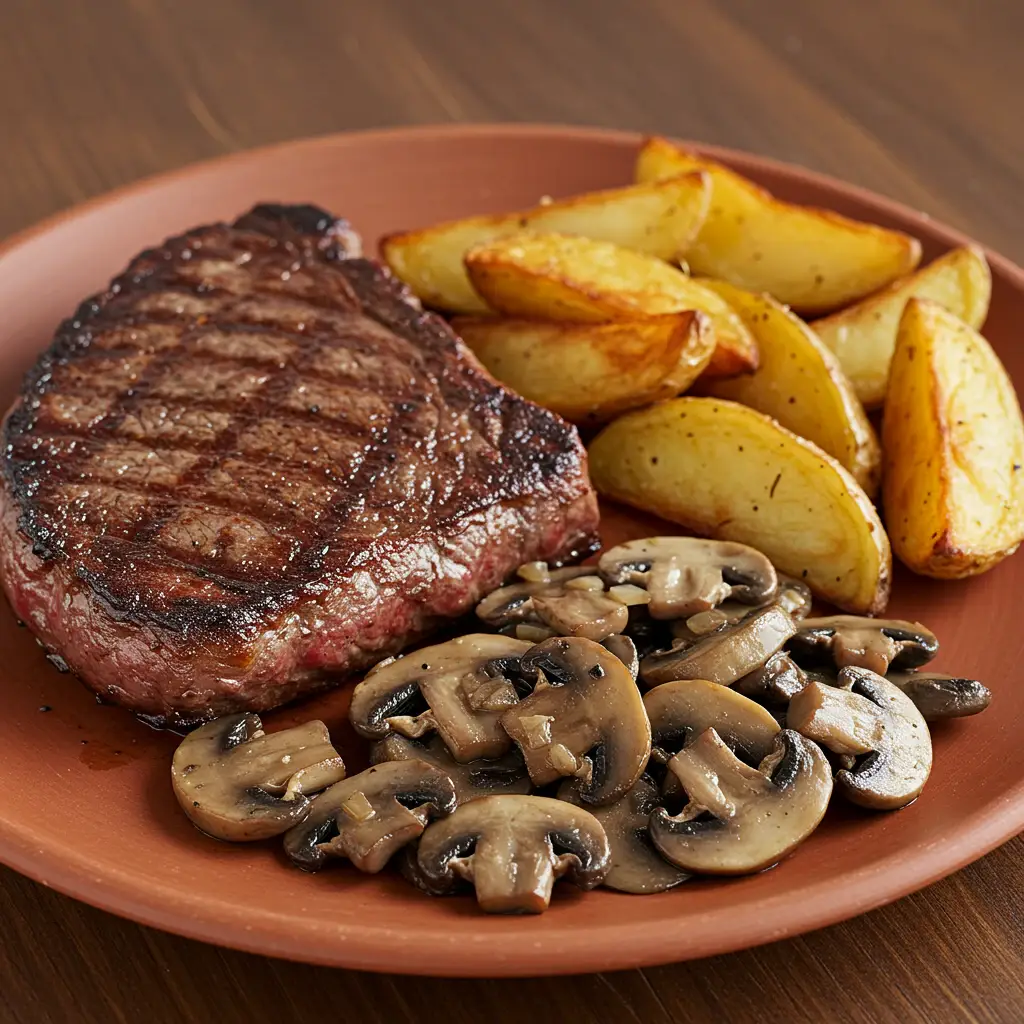 Um bife suculento grelhado na chapa, acompanhado de cogumelos salteados em manteiga e shoyu, e batatas fritas temperadas com um delicioso sal de ervas. Uma combinação perfeita de sabores e texturas!