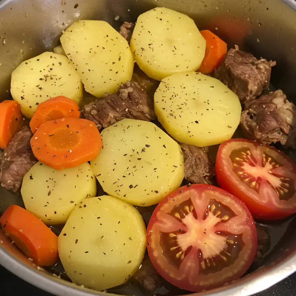 Um bife macio e saboroso, preparado com praticidade na panela de pressão. Acompanhado de batatas, cebola e tomate, um prato completo e delicioso para o dia a dia.