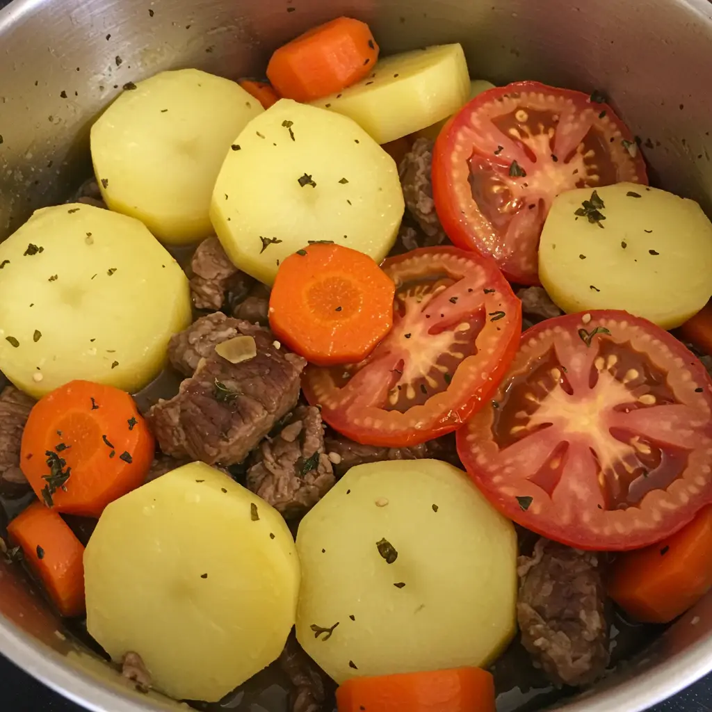 Um bife macio e saboroso, preparado com praticidade na panela de pressão. Acompanhado de batatas, cebola e tomate, um prato completo e delicioso para o dia a dia.