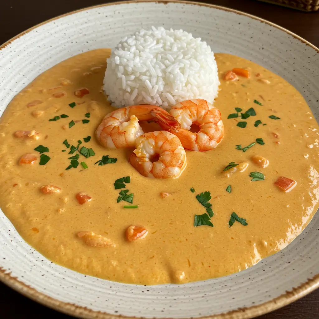 Sirva quente, decorado com camarões fritos (opcional) e acompanhado de arroz branco.