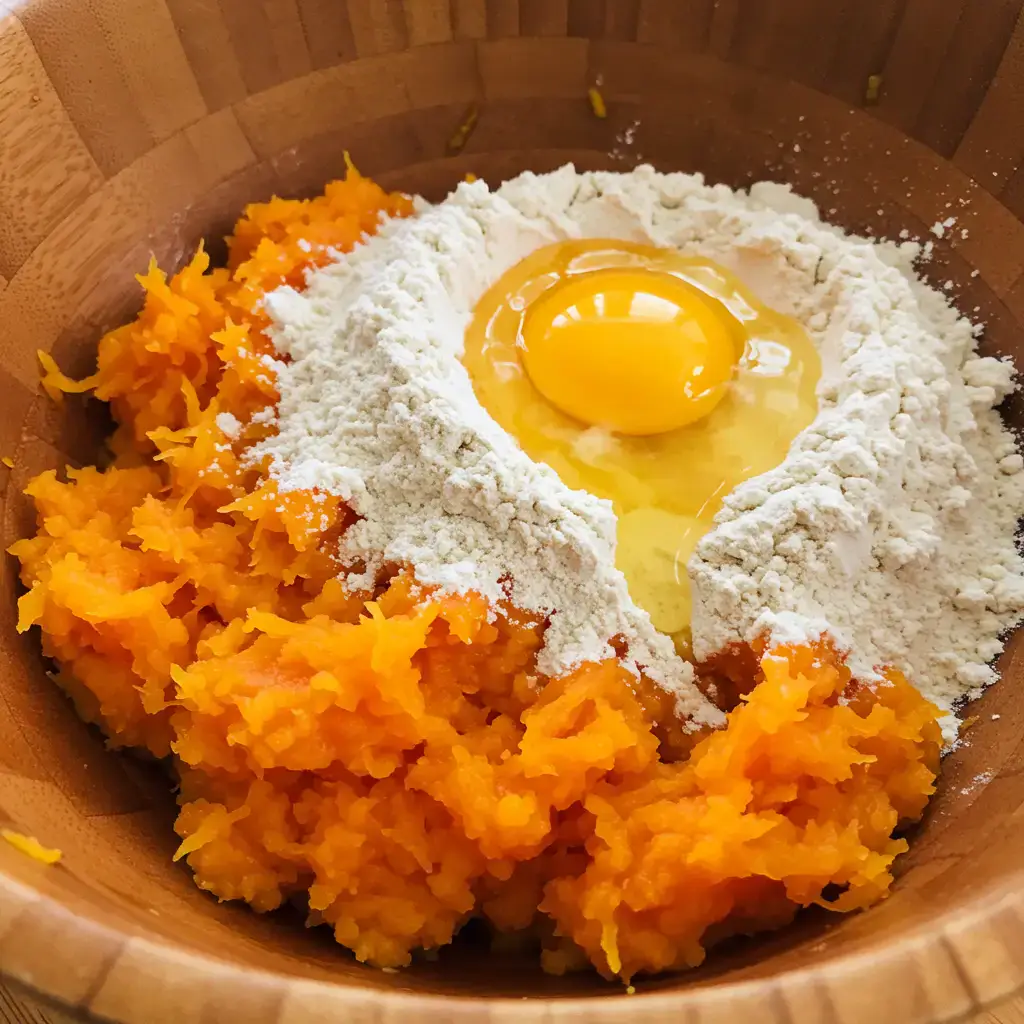 Em uma tigela, misture o purê de abóbora com o ovo, a farinha de trigo, a maisena, o fermento e o açúcar. Misture tudo até obter uma massa homogênea.