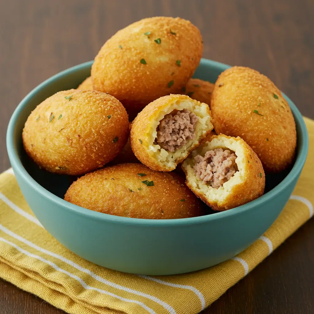 Deliciosos bolinhos de mandioca, macios por dentro e com um saboroso recheio de carne moída e mussarela. Uma receita tradicional brasileira, perfeita para um lanche ou aperitivo.