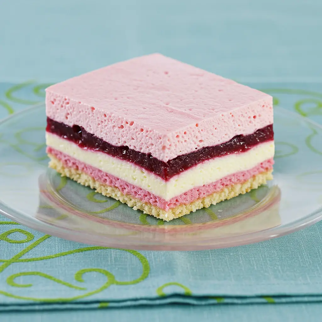 Um bolo macio e úmido, com camadas de gelatina de uva e morango, recheio cremoso de coco e cobertura leve de mousse. Uma explosão de cores e sabores que vai encantar a todos!