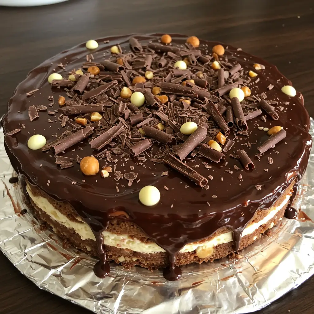Um bolo de coco macio e úmido, recheado com um irresistível brigadeiro de chocolate e coberto com uma cascata de chocolate ao leite, amendoim e raspas de chocolate. Uma explosão de sabores que vai te conquistar!