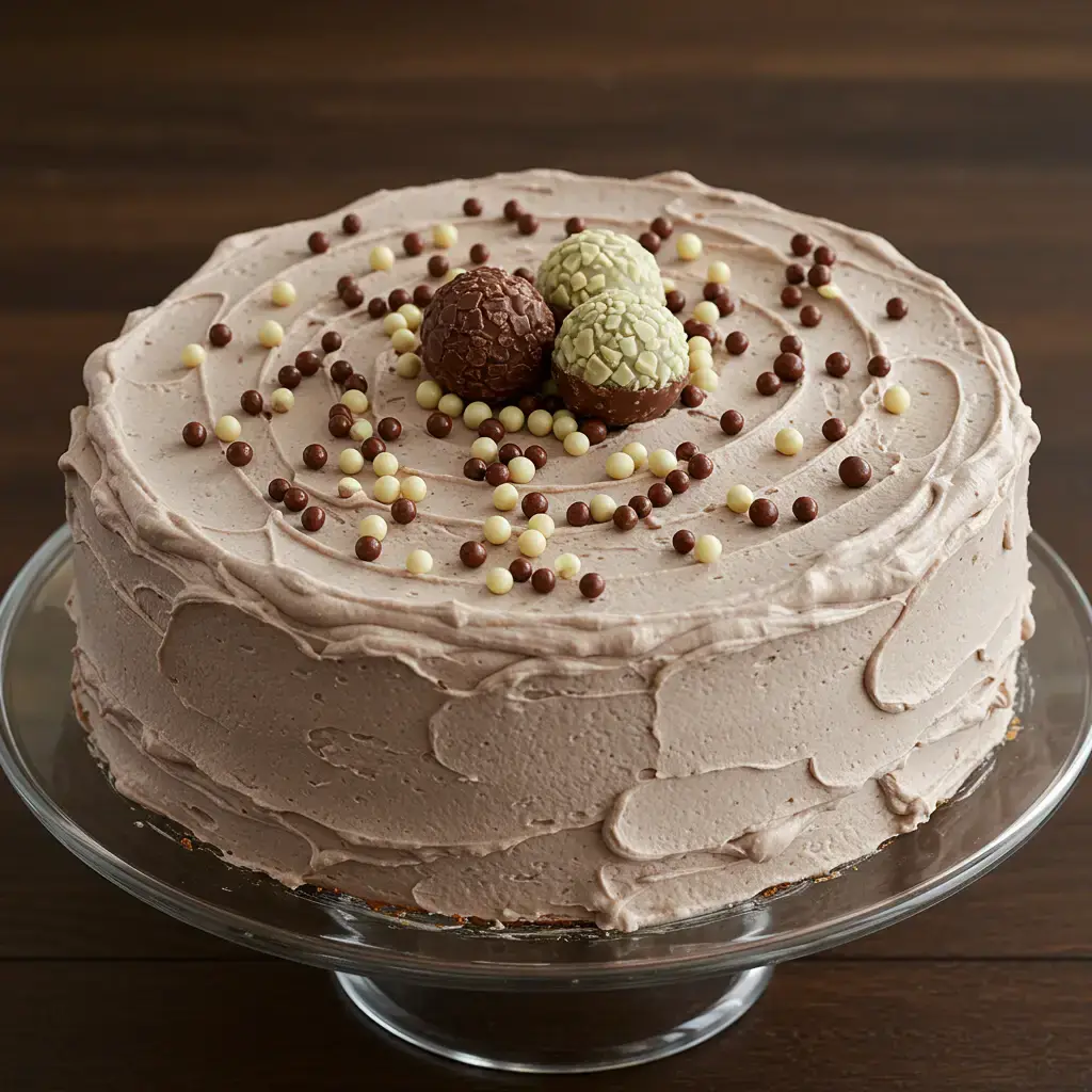 Um bolo macio de chocolate, molhadinho com calda de brigadeiro e coberto com chantilly, crispis e bombons. Perfeito para celebrar momentos especiais com muito sabor e beleza.