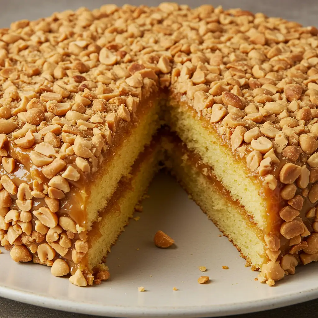 Um bolo úmido e saboroso, com o delicioso contraste do amendoim crocante. Perfeito para um lanche da tarde ou para acompanhar o café. A cobertura cremosa de leite condensado completa a experiência.