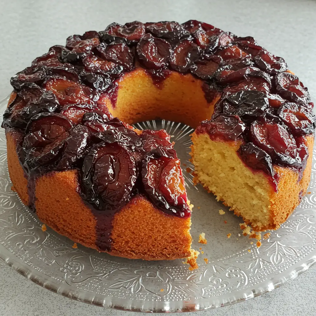 Retire o bolo do forno e deixe esfriar por alguns minutos antes de despejar a calda de ameixas ainda morna sobre ele.
