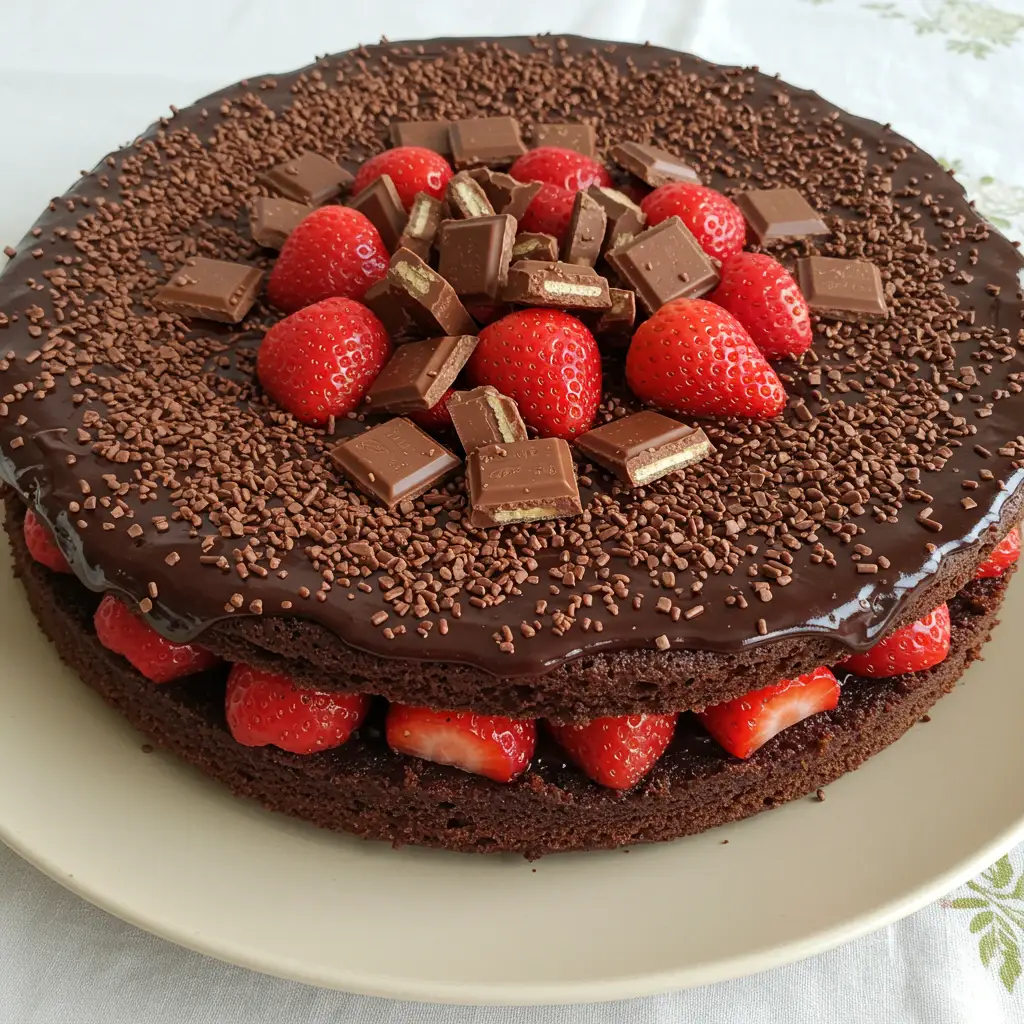 Um bolo macio e úmido de chocolate, recheado com um irresistível brigadeiro e pedaços de bis e morangos frescos. Uma combinação perfeita de texturas e sabores que vai te conquistar!