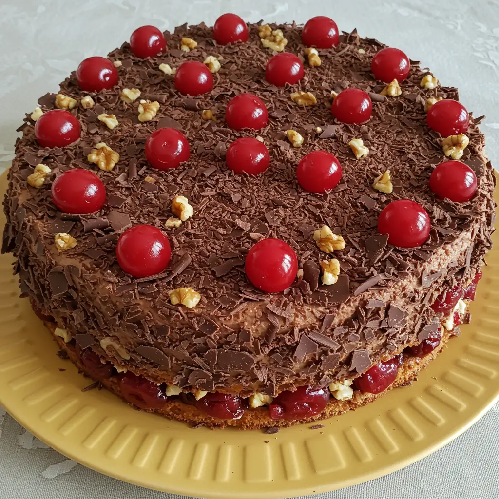 Um bolo de chocolate úmido e intenso, com o sabor marcante do vinho branco na calda, recheado com doce de leite, nozes crocantes e finalizado com chantilly e cerejas. Uma verdadeira explosão de sabores!