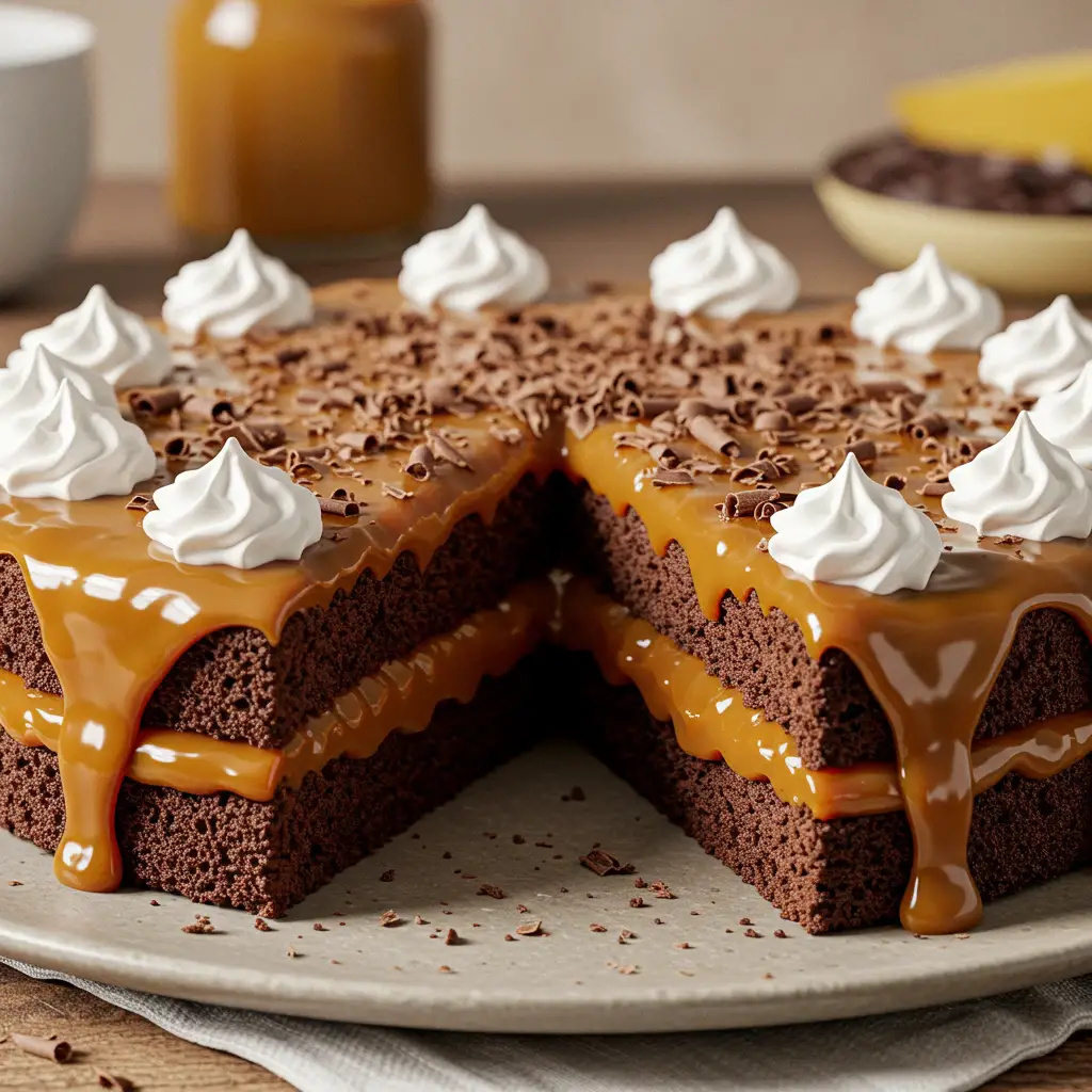 Delicie-se com este bolo de chocolate fofinho, recheado e coberto com um irresistível doce de leite. Uma combinação perfeita para os amantes de sobremesas!
