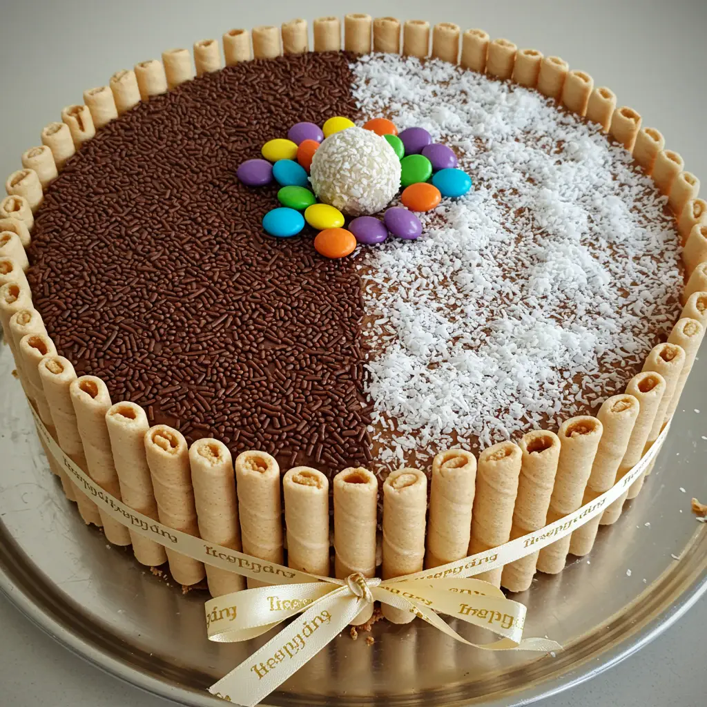 Um bolo de chocolate úmido e irresistível, coberto com um delicioso ganache de chocolate branco e decorado com diversas guloseimas. Perfeito para festas e ocasiões especiais!