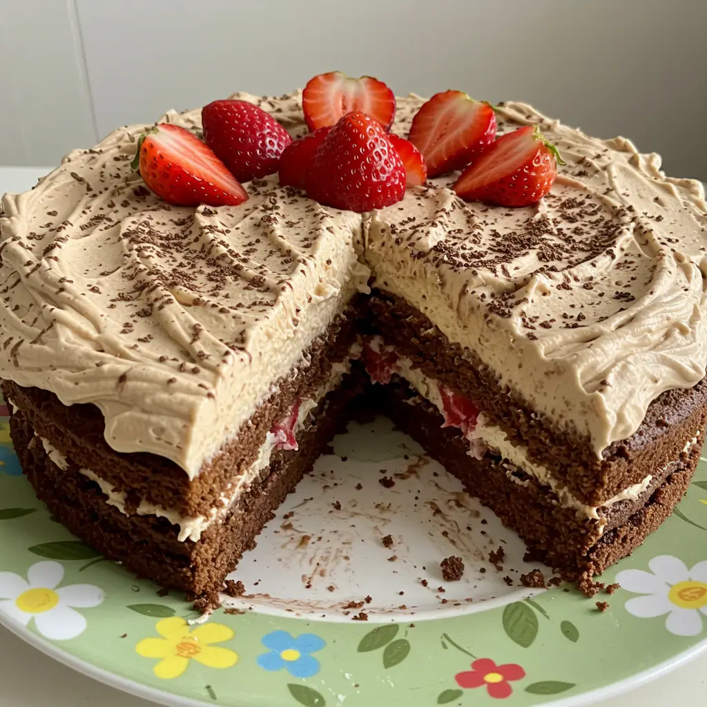 Um bolo de chocolate úmido e saboroso, com recheio cremoso de chocolate meio amargo e morangos frescos. Coberto com uma ganache brilhante e irresistível, finalizado com morangos e chocolate granulado.