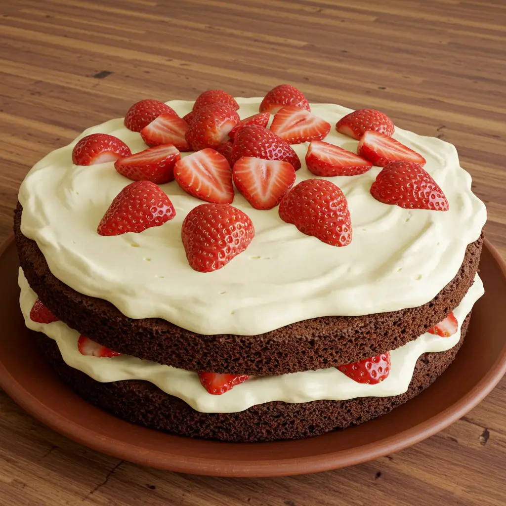Um bolo de chocolate úmido e irresistível, coberto com um creme delicioso de leite condensado e morangos frescos. Perfeito para um lanche da tarde ou sobremesa especial!